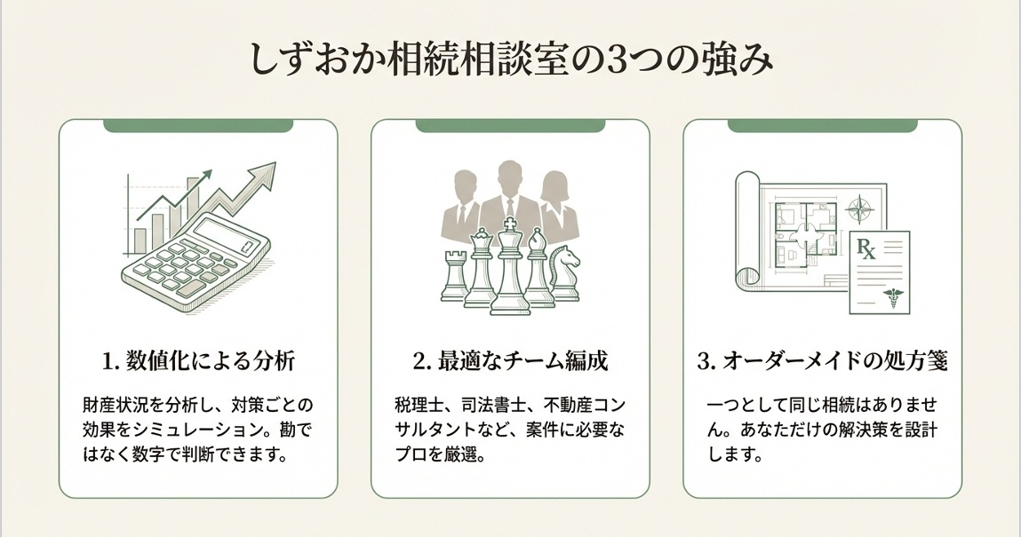 『しずおか相続相談室』にご相談くだされば、パワフルな相続専門家チームがあなたのお話を伺い、不安や問題点を整理して解決策を提案します。他の税理士や司法書士等の士業や保険代理店、不動産業者等へ相談せずに窓口を1つに絞ることができます。